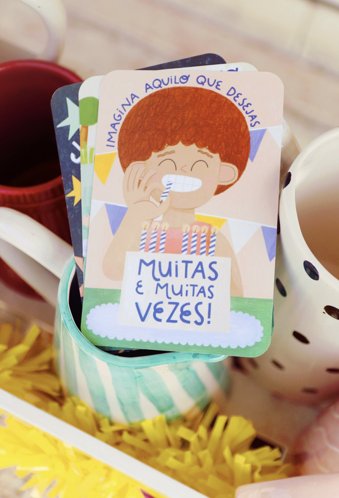 • Cartão ilustrado com criança e texto motivacional em caneca às riscas verdes
