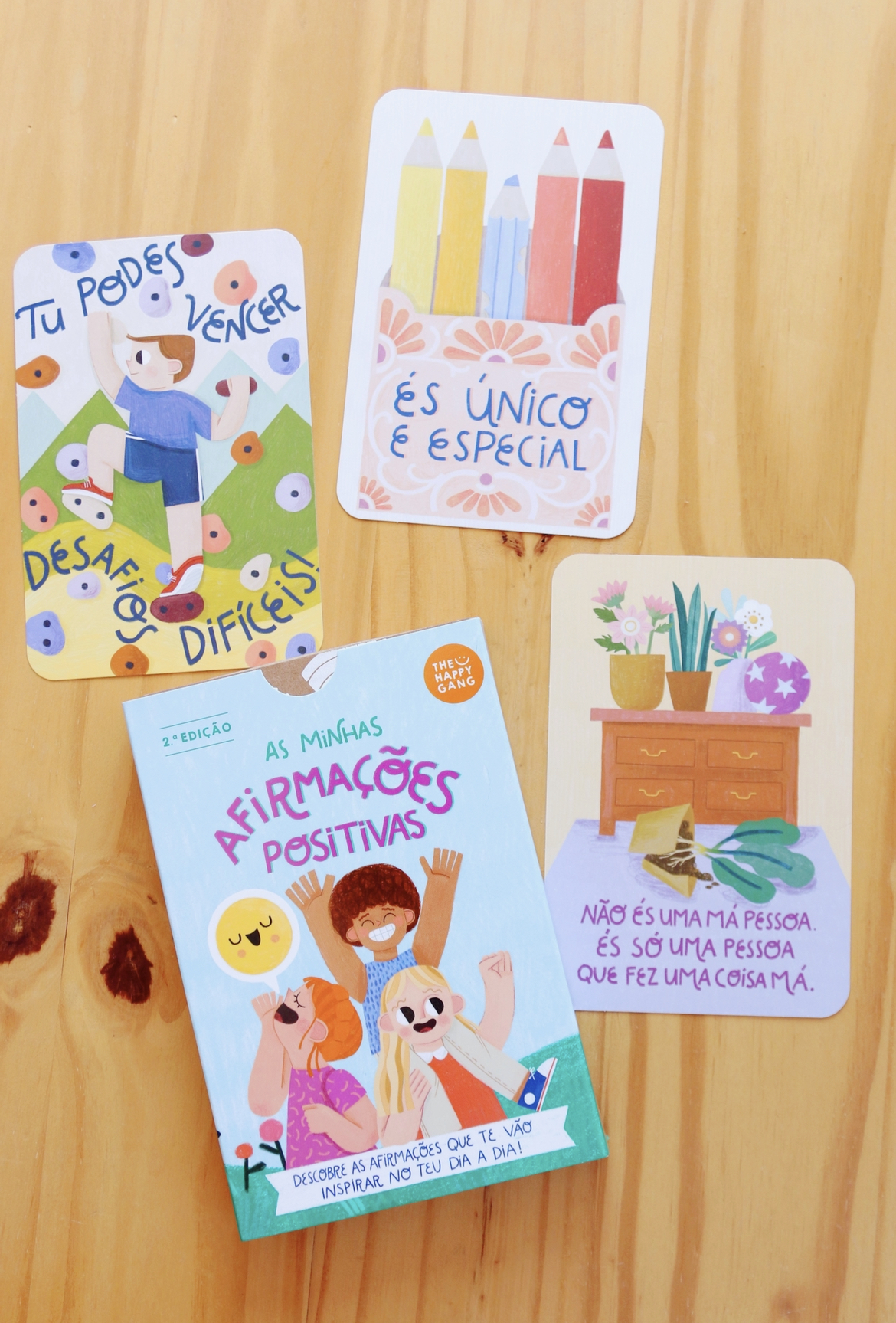 • Livro infantil com afirmações positivas e cartões coloridos com mensagens motivacionais em português sobre mesa de madeira clara