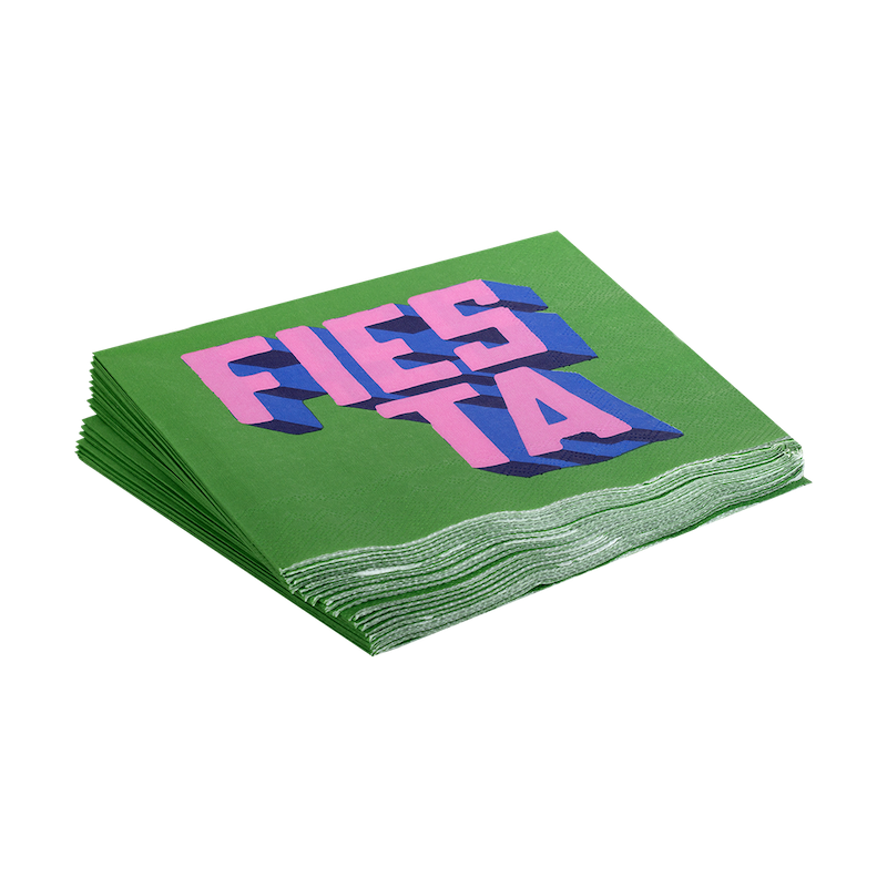 Guardanapo verde com texto rosa e sombra azul 'FIESTA'
