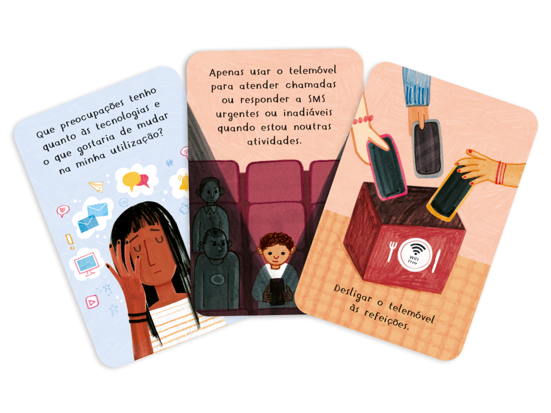 • Três cartas ilustradas com texto sobre uso do telemóvel, incluindo uma pessoa preocupada, pessoas numa sala e mãos a desligar telemóveis numa caixa.