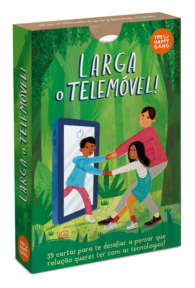 • Embalagem do jogo educativo Larga o Telemóvel! com texto e ilustrações em verde