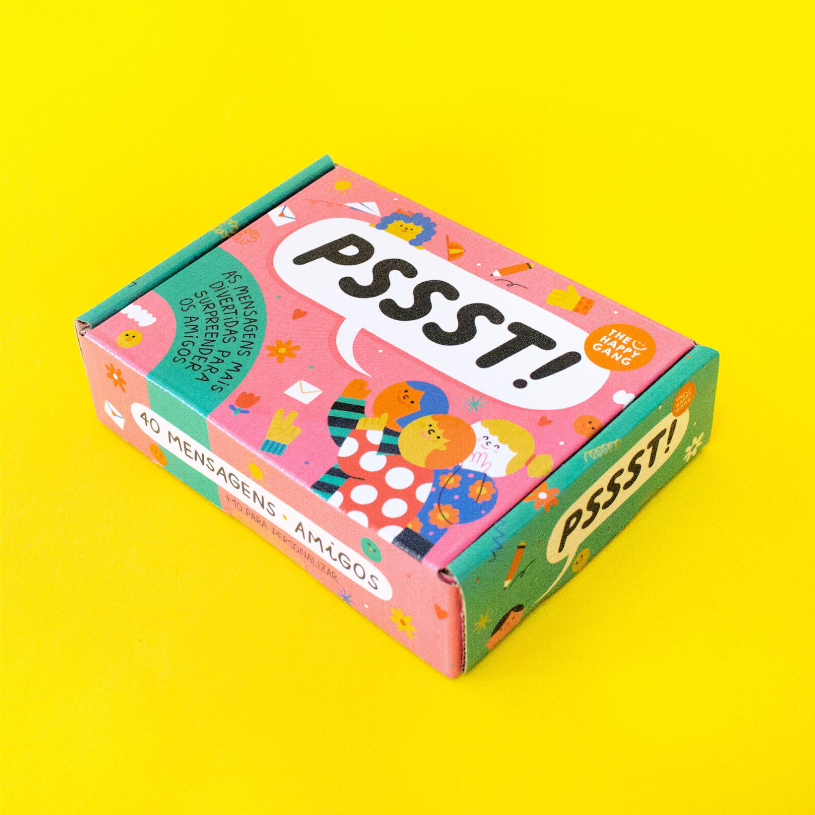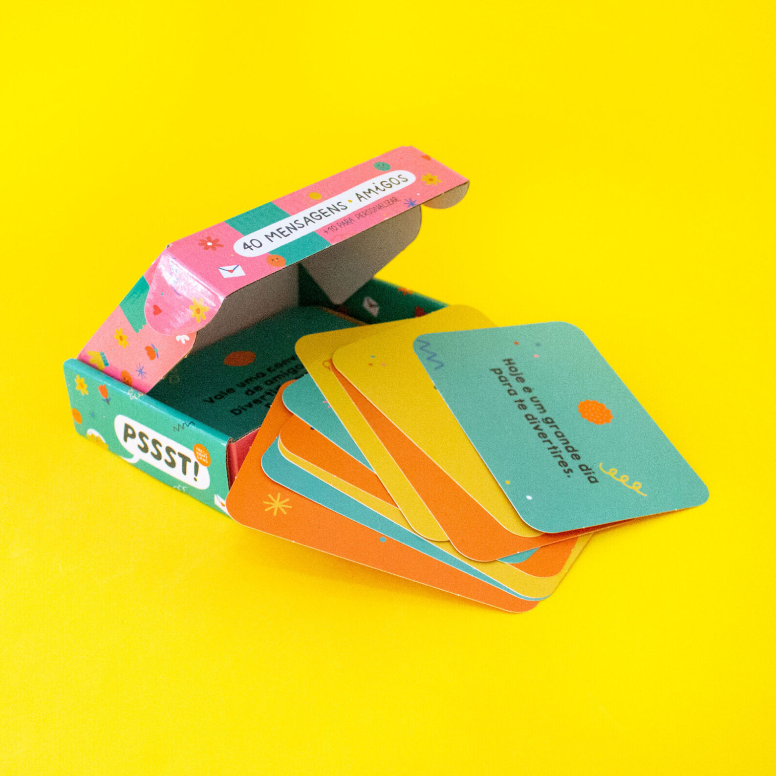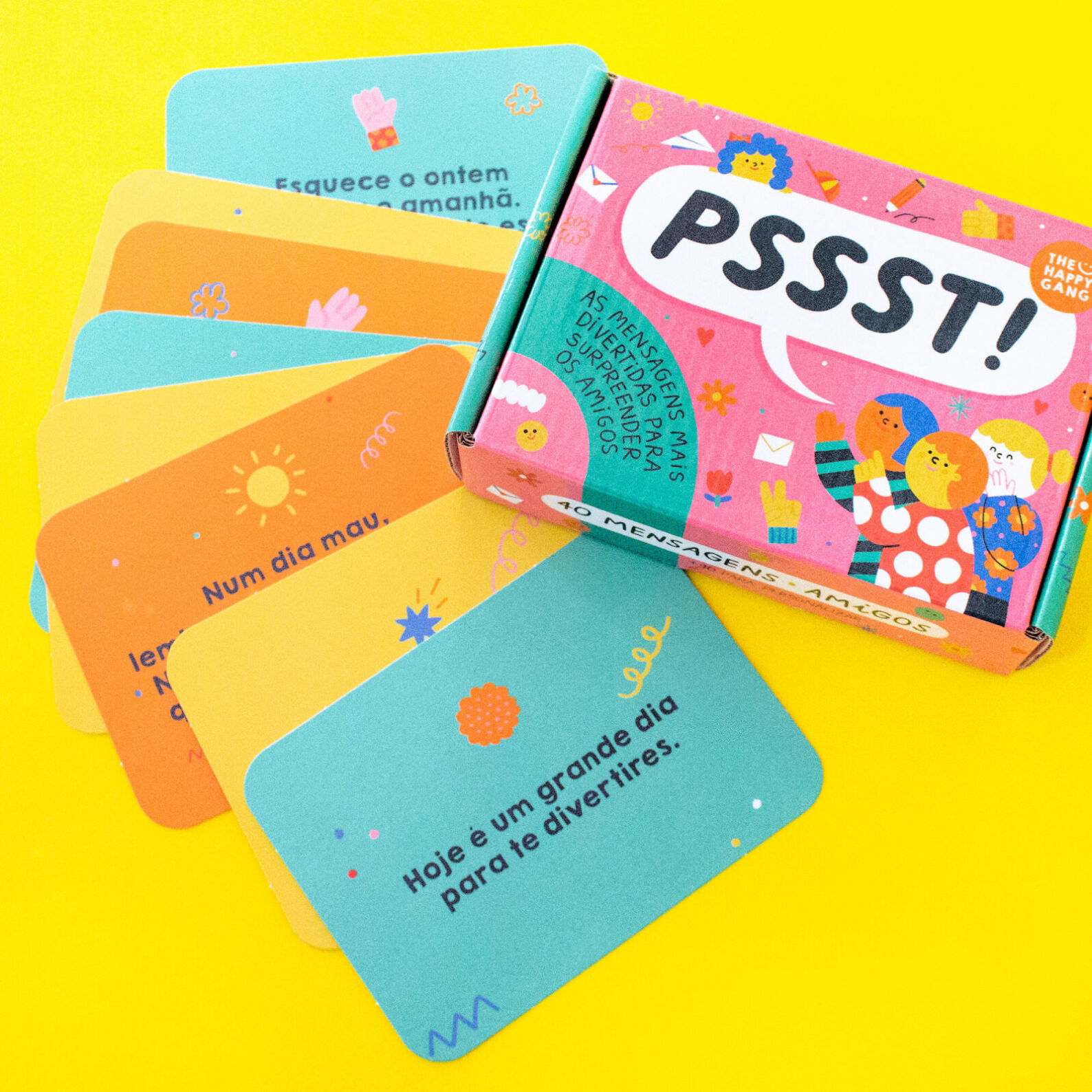 • Jogo de cartas coloridas com mensagens em português e caixa rosa com texto PSSST!