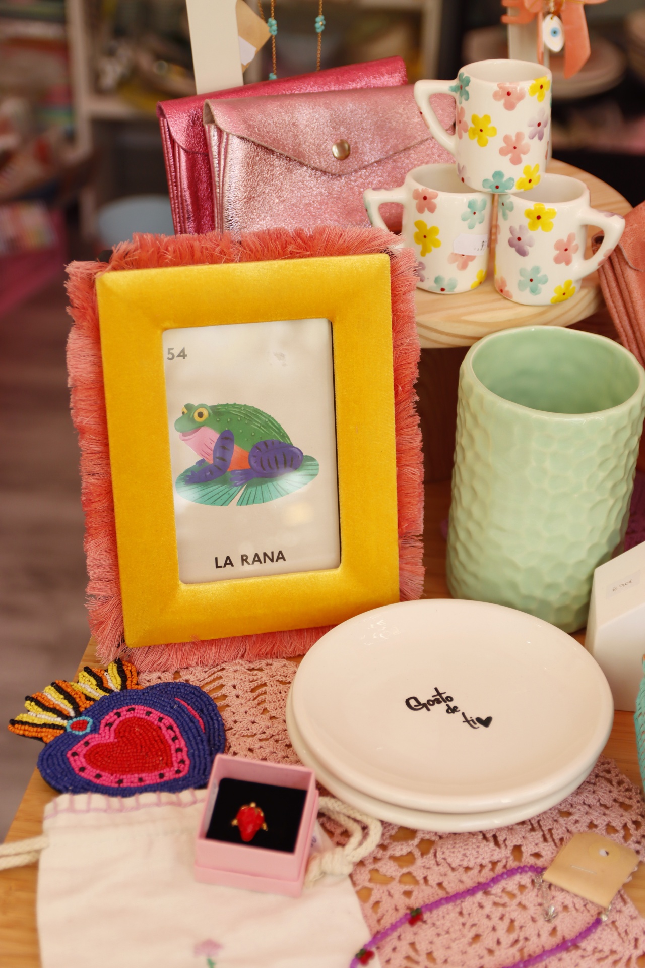 • Moldura amarela com carta de rã, canecas com flores, copo verde, prato branco com texto e acessórios em mesa de renda cor-de-rosa