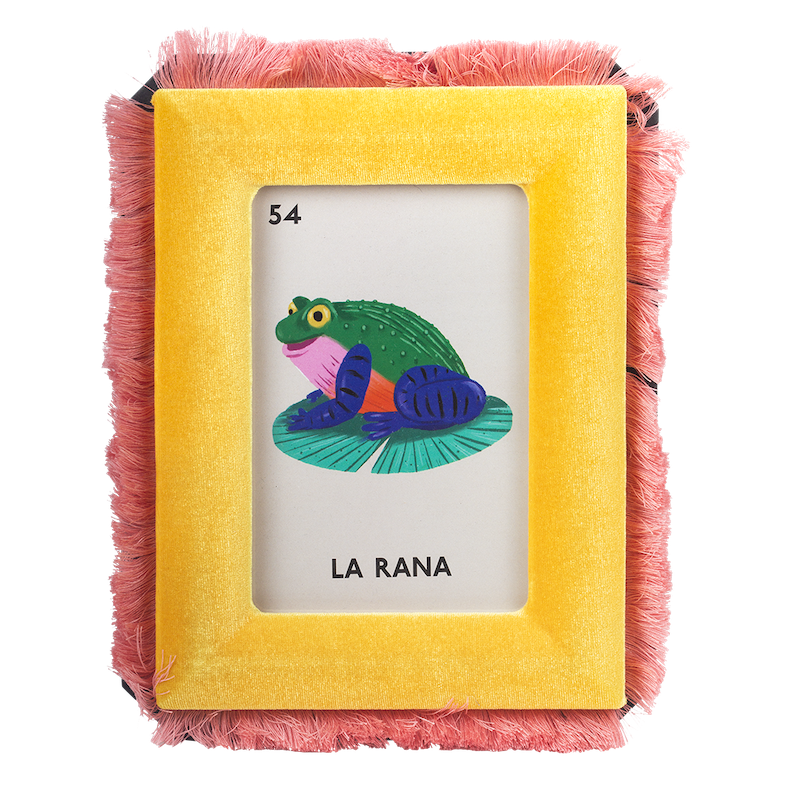 • Moldura amarela com franjas cor-de-rosa e cartão com rã ilustrada e texto 'LA RANA'